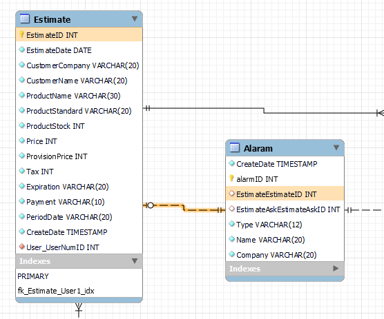 다만 insert 시점의 Estimate의 사용자 이름/회사를 Alarm에 저장하고 이후 update 시에는 Alarm 데이터를 수정하거나 추가하지 않는다면 관계를 그리지 않거나 그리더라도 Estimate의 컬럼 이름을 그대로 이용하는게 좋을 듯 합니다.