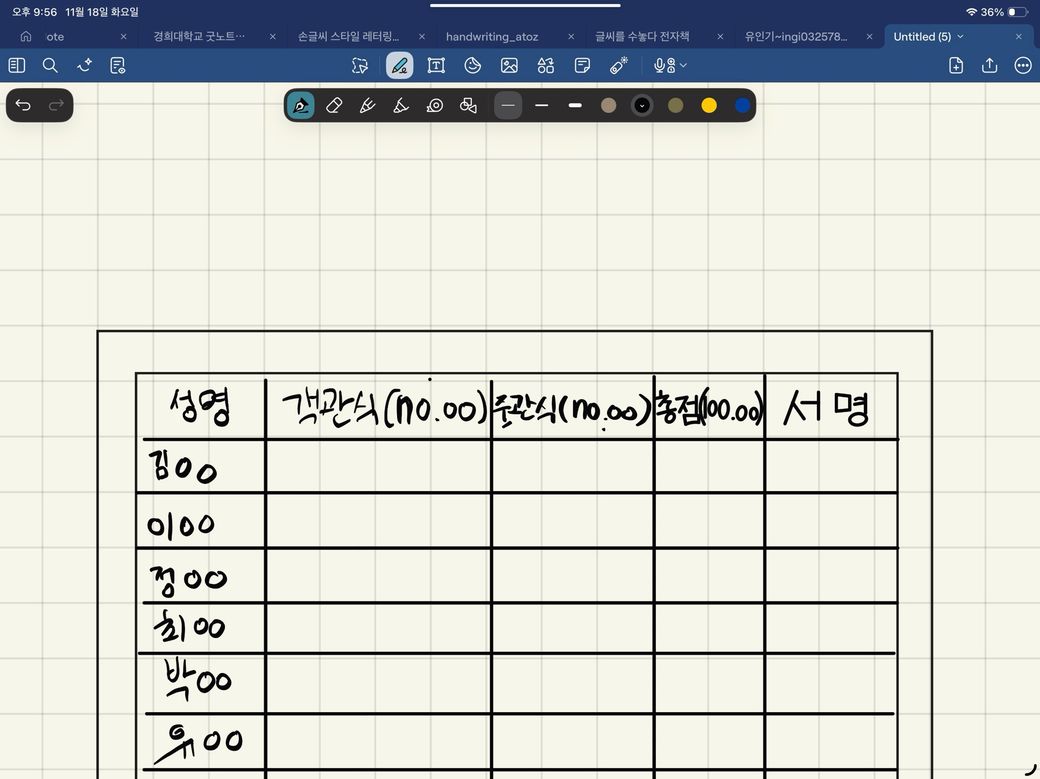 기억을 되살려 개판이지만 그려봤습니다. 제 학창시절에는 이런 거 칠판 옆에 게시하거나 선생님께서 두꺼운 종이에 구멍을 뚫어서 다른 친구들 성적표는 가리고 성적 보여주시고 서명하게 하셨거든요. 아니면 개인정보관련 법률이 강화되어서 안하고 있을까요?