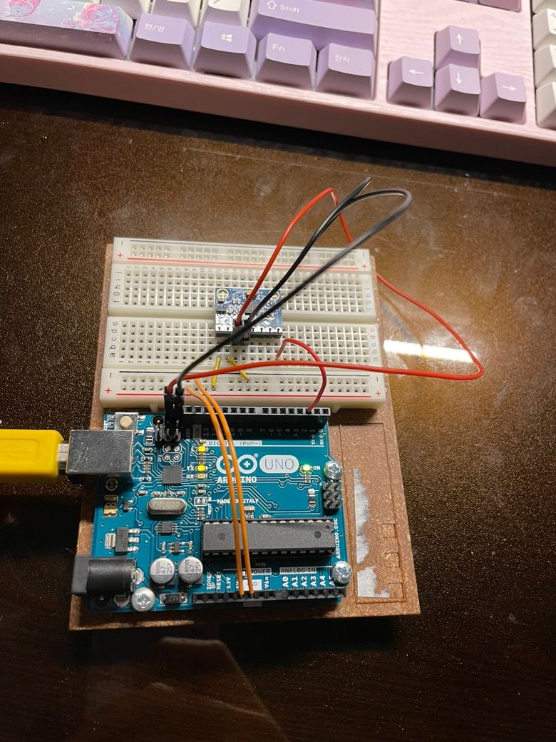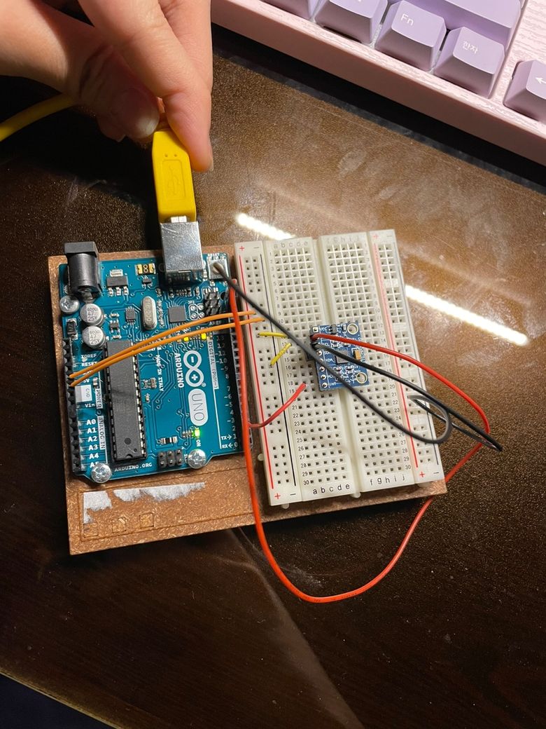 다음과 같이 선을 연결했는데 가속도가 제대로 측정되지 않고 있습니다. 제가 아두이노에 대해 문외한이라 정확한 원인을 모르겠는데 해결법을 알려주시면 감사하겠습니다