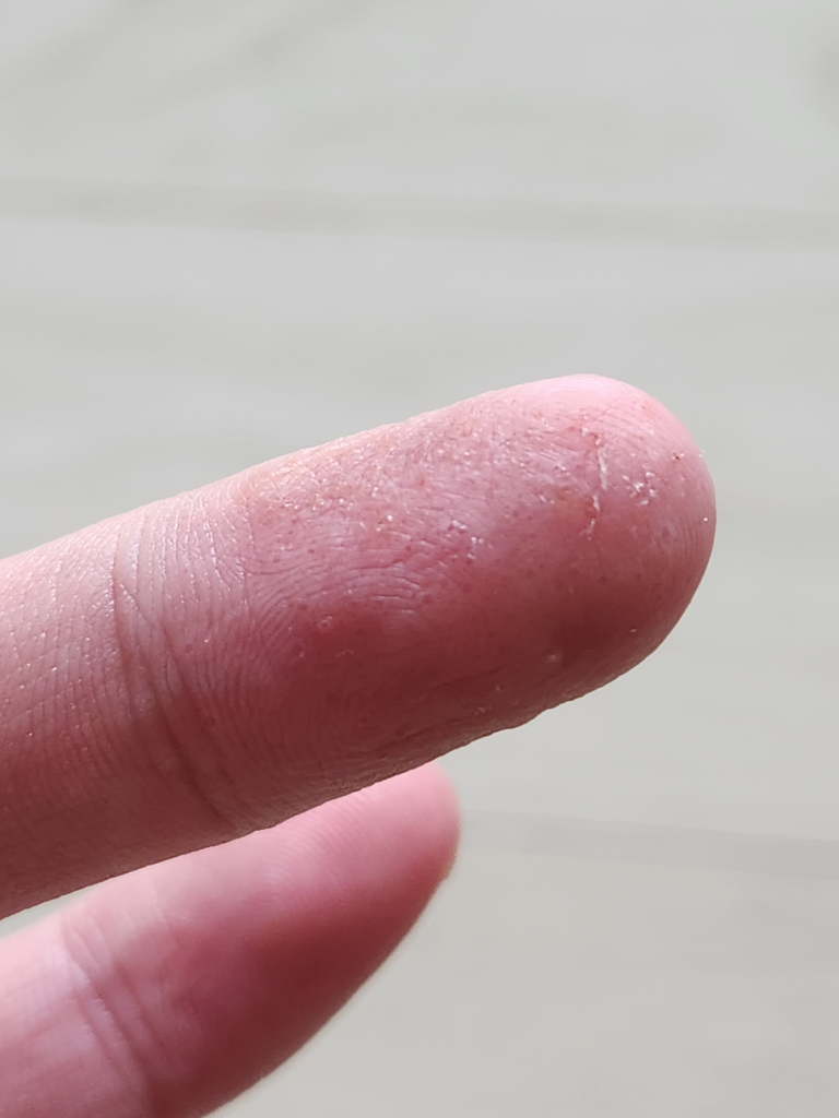 한포진이 발생하신 상황으로 보입니다. 현재 수포가 터지고 각질화된 상태로 보이니 각질연화제를 사용해볼 수 있을 것 같고, 피부과를 방문해보시는게 좋겠습니다.