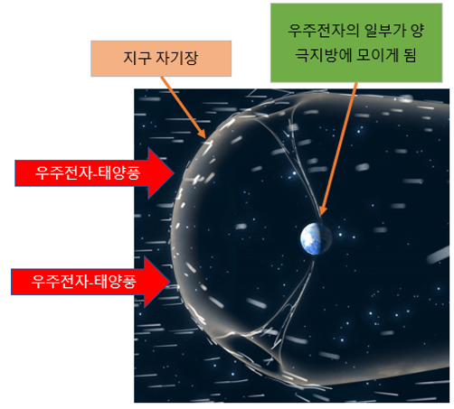 태양에서 날아오는 대전입자가 지구가까이에 오면 대부분 지구자기장 밖으로 흩어지지만 그중 일부는 지구자기장에 붙잡혀 지구의 N극과 S극인 북극과 남극에서 남북으로 왕복운동을 하게 됩니다.