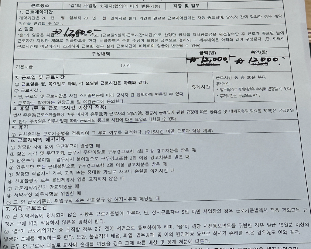 근로계약서에 시급총액에 주휴수당이 포함되어 있다고 했으니 주휴 포함 12000원으로 보는게 맞습니다.