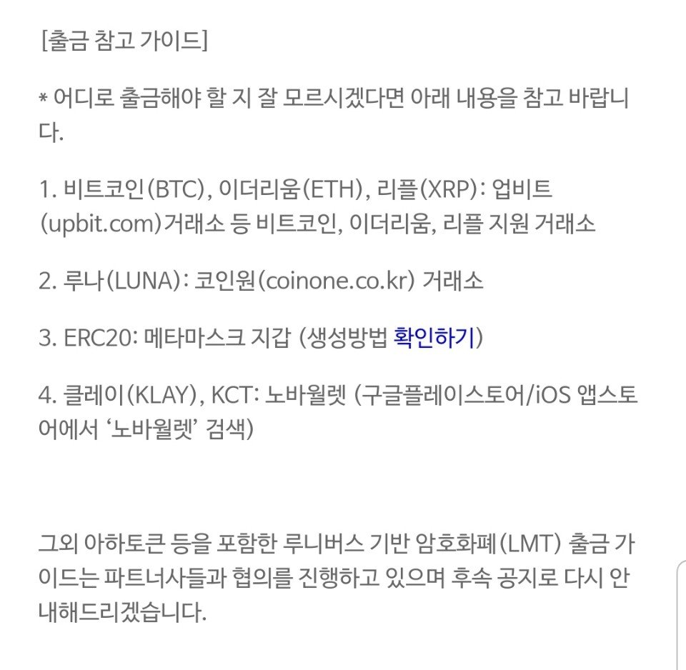만약 ERC-20 및 기타 암호화폐를 보유중인 사용자는 다른 암호화폐 지갑을 출금을 완료하여야 합니다.