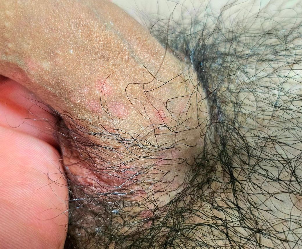 오늘 갑자기 발견했습니다 가렵거나 아프진 않고(맨위 사진에 반점은 누르면 살짝 아픔) 최근 성관계를 가진적이 없으나 저가 운동을 자주해서 혹시 그거랑 관련이 있나요? 모낭염이라면 약국에서 연고 사서 바르면 될까요?