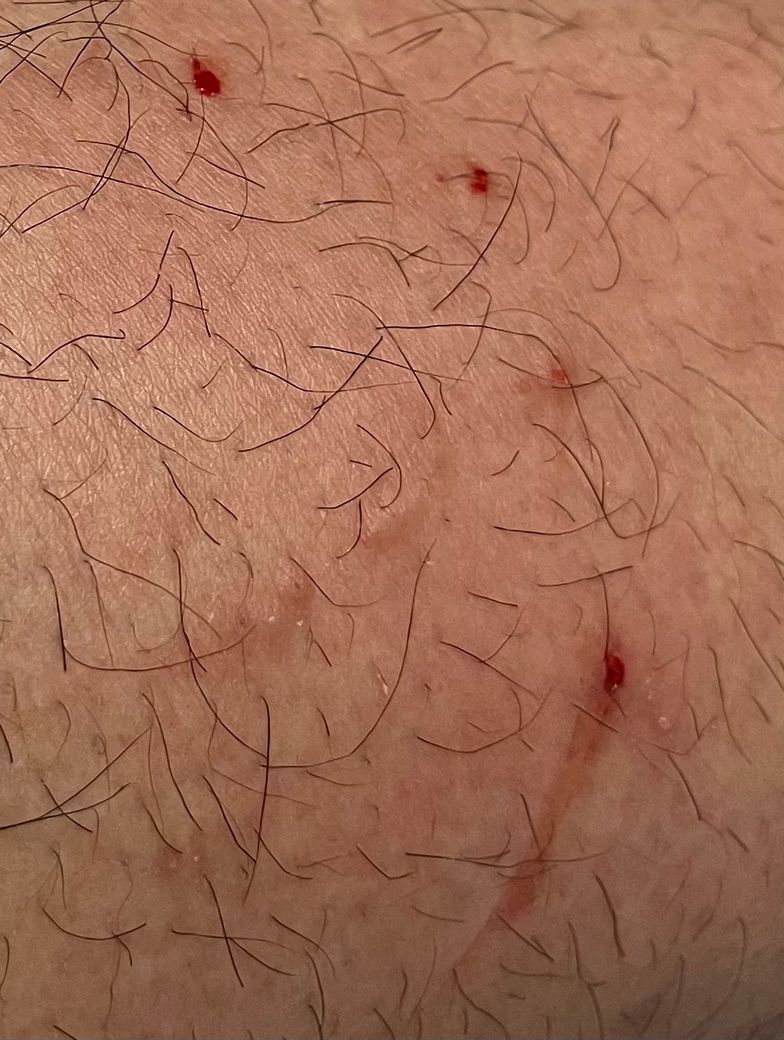 사진에서 보이는 병변은 전형적인 두드러기 형태와는 다소 차이가 있습니다. 두드러기라면 피부가 넓게 부풀어 오르는 팽진 형태로 나타나는 경우가 많고, 보통 긁은 자국을 따라 길게 올라오는 경우가 흔합니다. 현재 사진에서는 털이 있는 부위 중심으로 작은 붉은 점과 미세한 출혈, 긁힌 상처가 관찰됩니다.