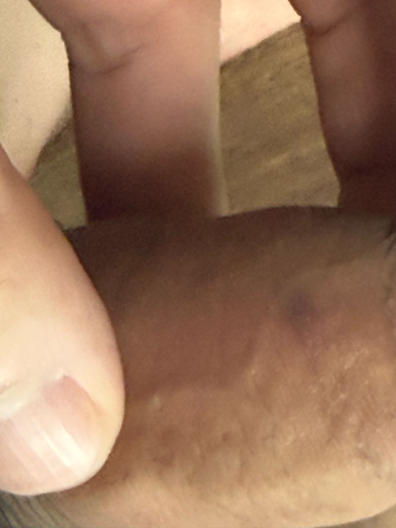 감별로는 다음이 우선 고려됩니다. 첫째, 경미한 외상이나 마찰에 의한 피하출혈 또는 혈관 확장 병변. 둘째, 모낭염 초기나 국소 피부염. 셋째, 드물지만 편평사마귀나 초기 곤지름의 비전형적 형태. 다만 전형적인 곤지름은 살색 내지 회백색의 돌출성 병변이 많고, 현재 사진은 뚜렷한 사마귀 모양은 아닙니다.