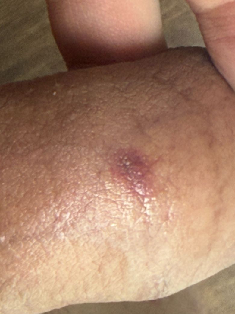 사진상으로는 경계가 비교적 불분명한 자주색 내지 적색 반점으로 보이며, 표면이 약간 울퉁불퉁해 보입니다. 말씀하신 것처럼 통증이 거의 없고, 만져지는 뚜렷한 결절이 없다면 급성 세균성 감염이나 전형적인 궤양성 성병 가능성은 높지 않아 보입니다.