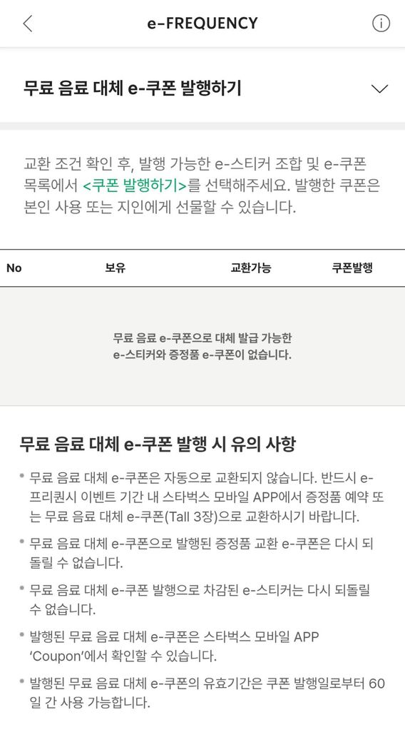어차피 오늘까지 프리퀀시 기간이라서 그동안 적립한걸로 쿠폰 변경 가능하다고 들었거든요 그런데 어플에서 무료쿠폰 발행 버튼 눌렀더니 별다른 내용이 안나와서요