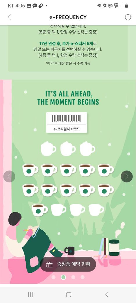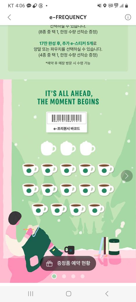 스타벅스 2025 겨울 e-프리퀀시(10월 30일~12월 31일)는 오늘 종료를 앞두고 적립된 e-스티커를 증정품 교환 e-쿠폰으로 발행할 수 있습니다. 스티커가 17장(미션 3장 포함) 완성되지 않았거나 앱 오류로 버튼이 제대로 작동하지 않을 수 있어요.