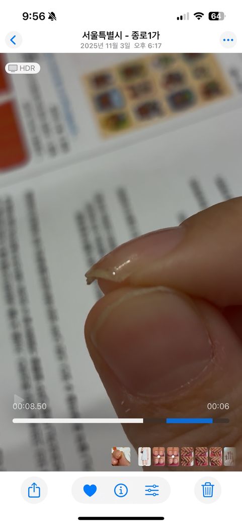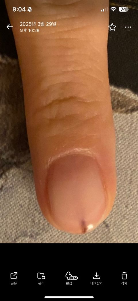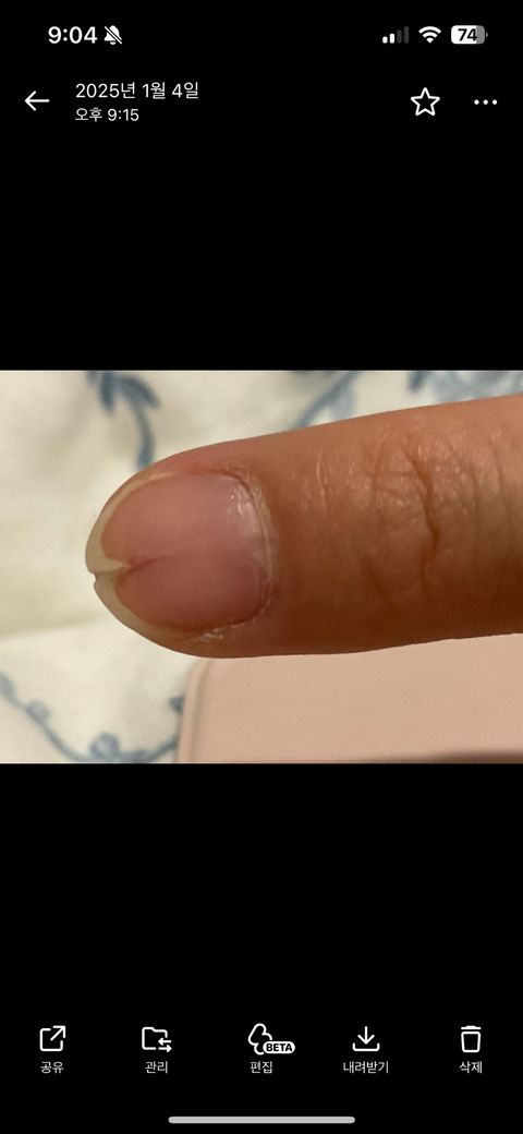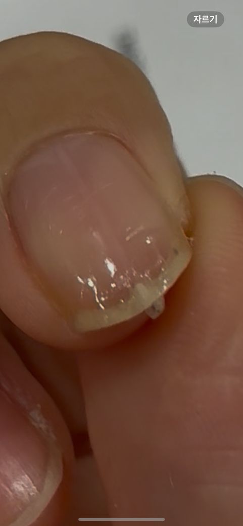 살이자랐습니다. 갈라진 손톱이 불편하여 손톱을 붙이는 네일을 받았고 그 후 손톱은 붙었으나 손톱 밑 중앙에서 또 가닥처럼