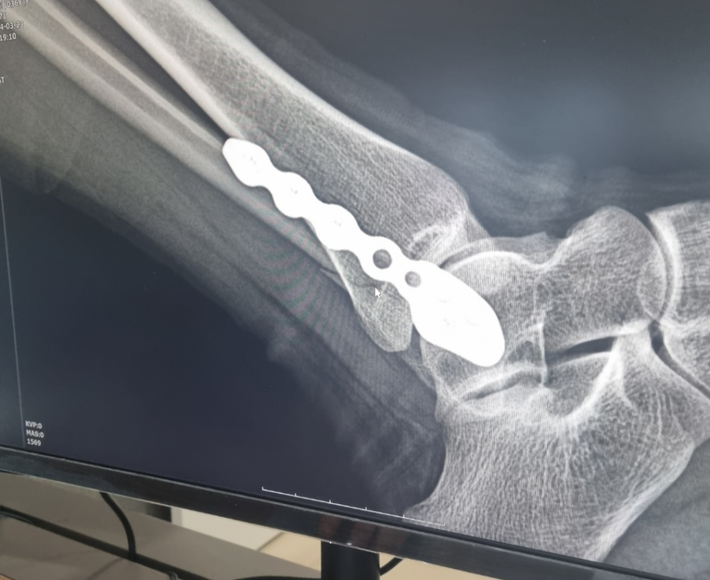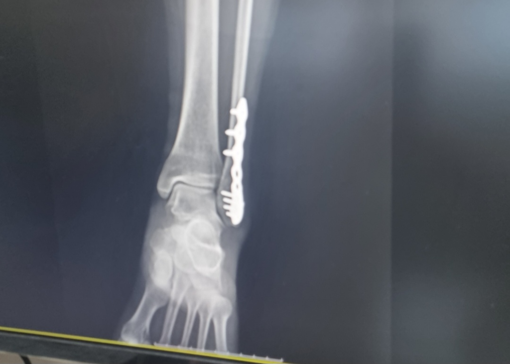 첫 번째 사진은 비골골절 직후 수술 전 사진이고