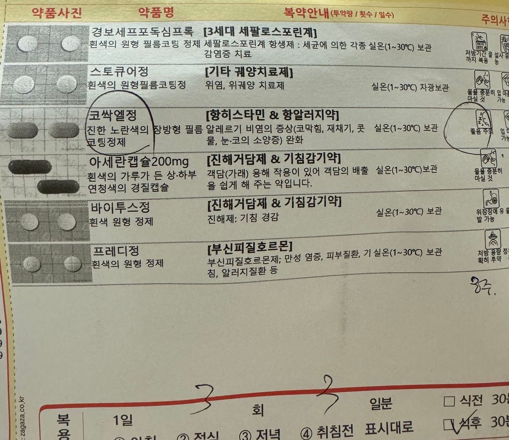 몸에 감기기운이 있어서 처음에 가정의학과 가서 처방 받은 내역이구요 코로나 검사는 안 했어요 저거 다 먹고도 기침이랑 콧물이 남아있어서 다른 이비인후과에 가서 받아온 처방이 두번째 사진인데 아침,점심,저녁 다 항생제가 들어있구요 점심약만 다 먹은 상태인데 약학과에 다니는 동생이 항생제 먹는거 좋지 않다고 저기에서 항생제만 빼고 먹으라고 하는데 그렇게 해도 될까요 ?? 답변 부탁드립니다 ㅜ