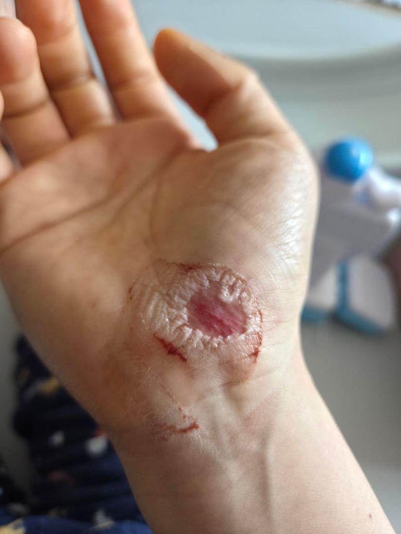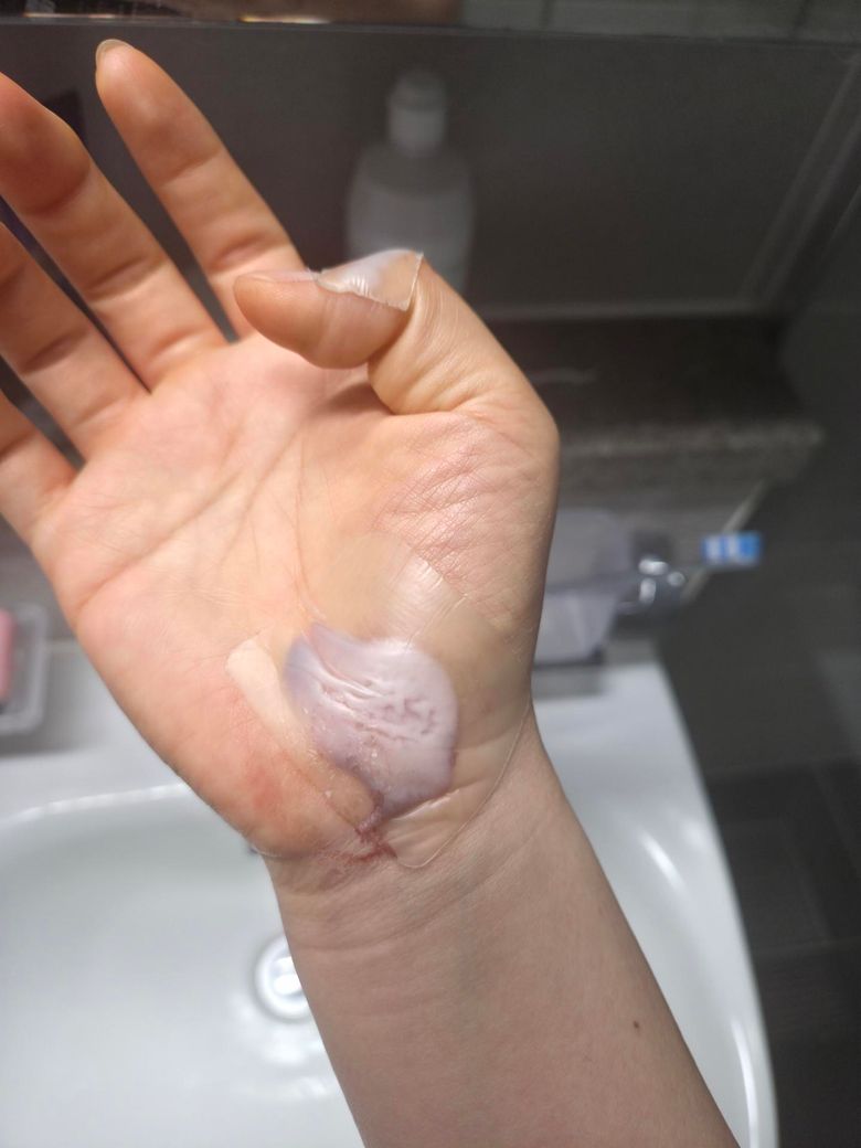 사진상 손바닥에 비교적 넓은 찰과상과 일부 진피층이 드러난 상태로 보입니다. 가장자리 피부가 불어 보이는 것은 하이드로콜로이드로 인한 과습윤 소견이며, 중심부 발적과 진물은 아직 염증 반응이 진행 중이라는 의미입니다. 손바닥은 마찰이 많고 각질층이 두꺼워 치유가 느리고 통증이 큰 부위입니다.