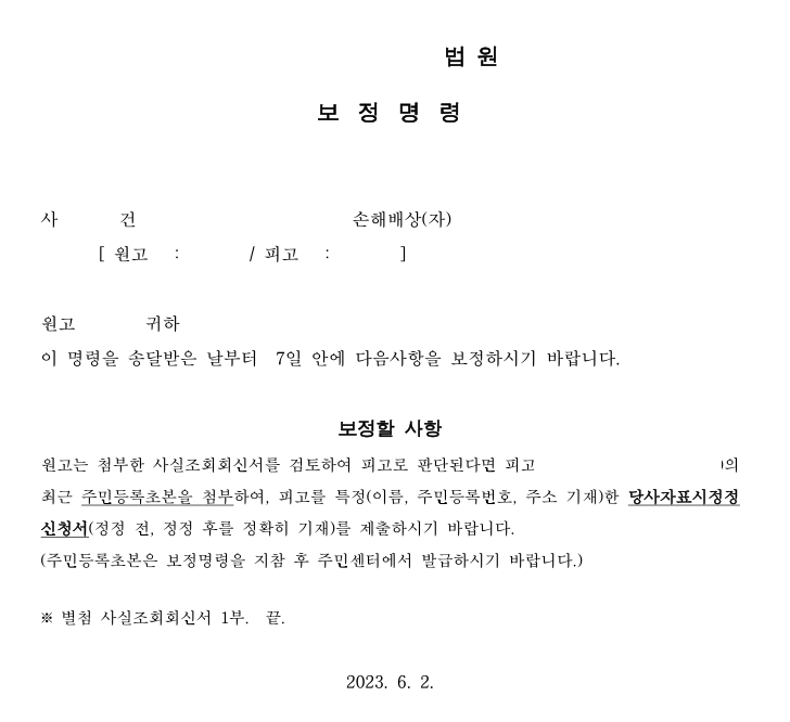 아래와 같이 6월 8일에 보정명령을 받았습니다. 보면 송달받은 날부터 7일 안에 다음사항을 보정하라고 나오는데 오늘은 개인사정이 있어서 주민센터 갈 시간이 애매한데 6월 14일에 서류 제출해도 문제 없을까요?