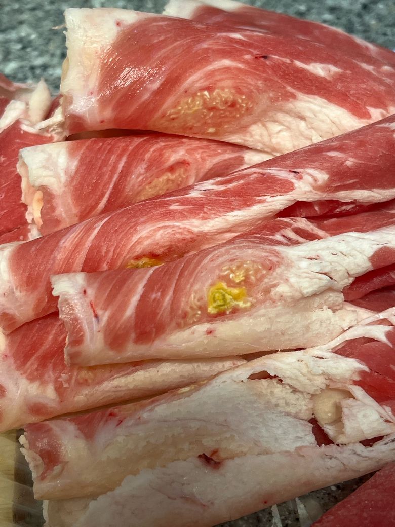 교환 요청하세요. 드시는 것 아닙니다. 사진 소견만 기준으로 보면 정상 지방이나 마블링이라기보다는 병적 변화 가능성이 더 높은 형태입니다. 근육층 사이에 노란색의 국소 병변이 보이고, 주변에 낭성 구조처럼 보이는 부분이 동반되어 있어 일반적인 차돌박이 지방 구조와는 다릅니다.