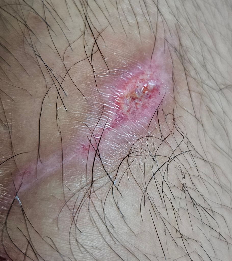 상처가 회복이 되고 있는 과정에서 흔히 보일 수 있는 소견이긴 합니다. 정강이 부윈 혈류가 많이 가지 않기 때문에 회복력이 다소 떨어지는 부위이기 때문에 잘 관리해주면서 경과를 지켜보시길 바랍니다. 예후가 좋지 않을 경우 쉽게 회복이 되지 않을 수도 있습니다.