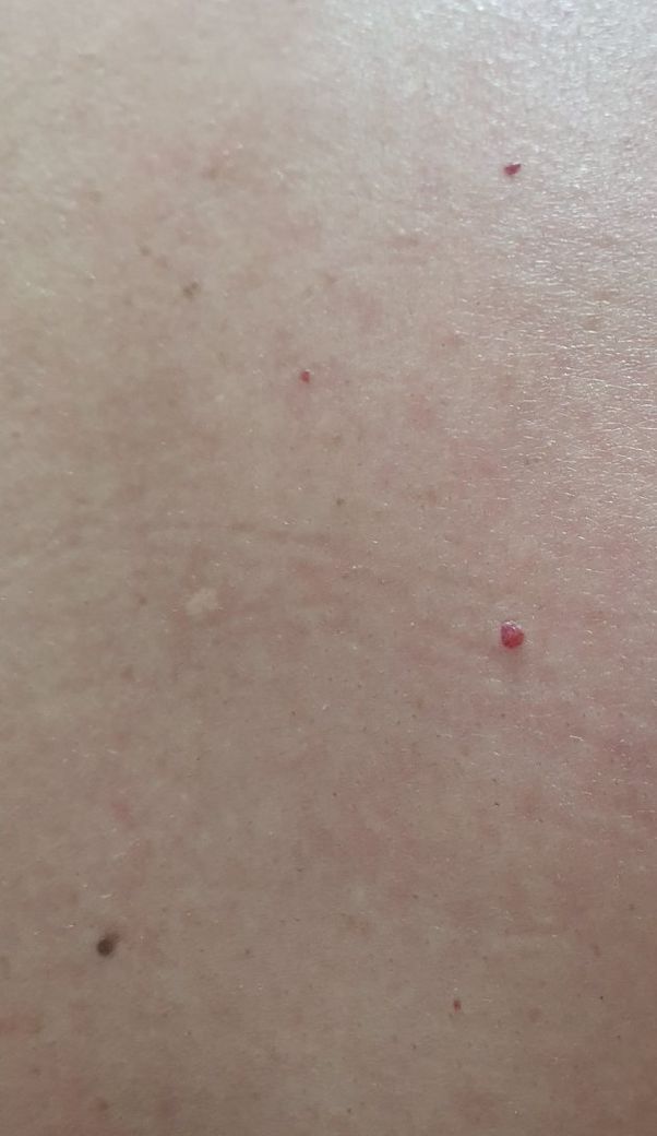 상기 증상은 체리혈관종으로 생각되며 가까운 피부과에서 진료를 통해 호전을 보일 수 있습니다.
