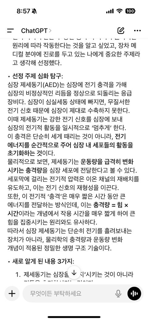 물리 전문가님들... 저 좀 도와주세요 저 세특 적어야하는데 이 제세동기가 충격량이랑 관련있는건지 모르겠어요.. 저 사진의 글이 맞는지 확인해주세요..