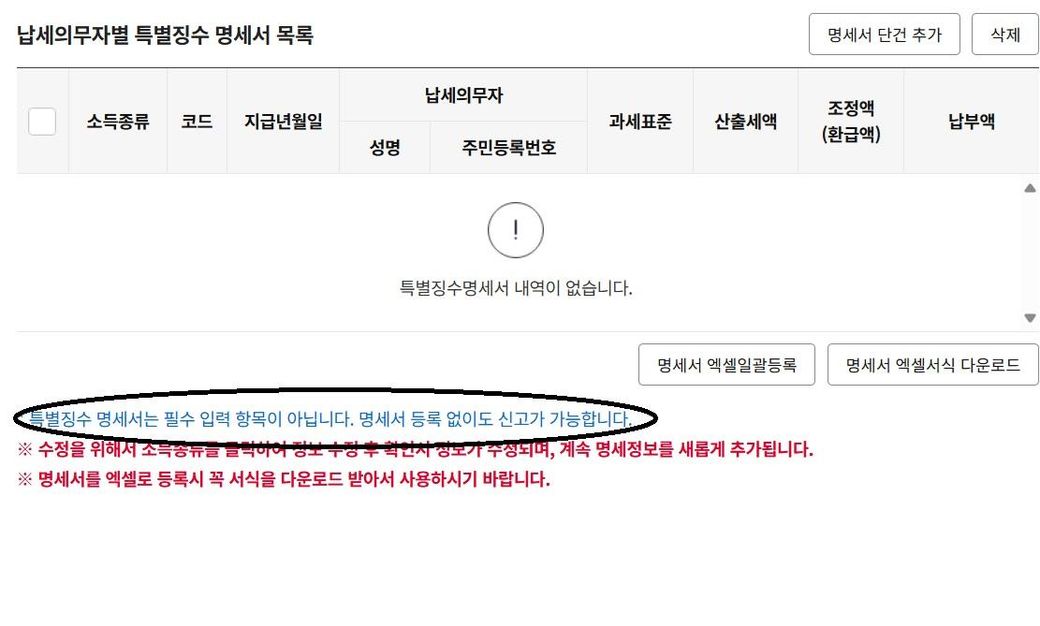 " * 특별징수 명세서는 필수 입력 항목이 아닙니다. 명세서 등록 없이도 신고가 가능합니다. "라고 뜨는데