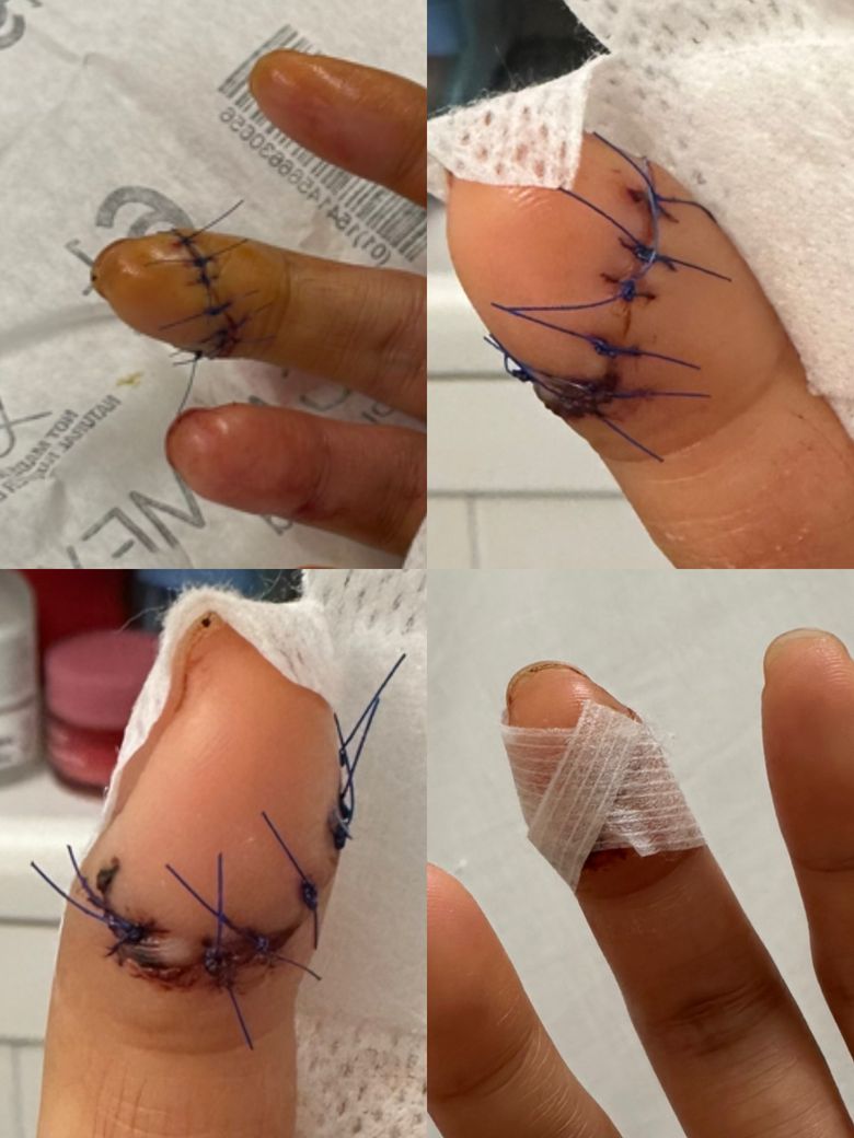 호주에서 칼에 깊게 베여 7바늘 봉합했습니다. 부위는 오른손 중지 첫마디입니다. 12.25에 꿰메서 1월 6일에 실밥 제거했어요. (사진은 순서대로 봉합 직후, 1주차 사 진 두장, 현재 실밥제거 후 병원에서 처치해준 것입니 다.)