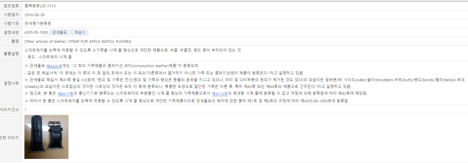 시계줄을 가죽이나 콤퍼지션 레더로 만든 휴대용 시계줄(9113.90-2000)과 그 밖의 가죽제품(4205.00-1900)로 분류하였습니다.