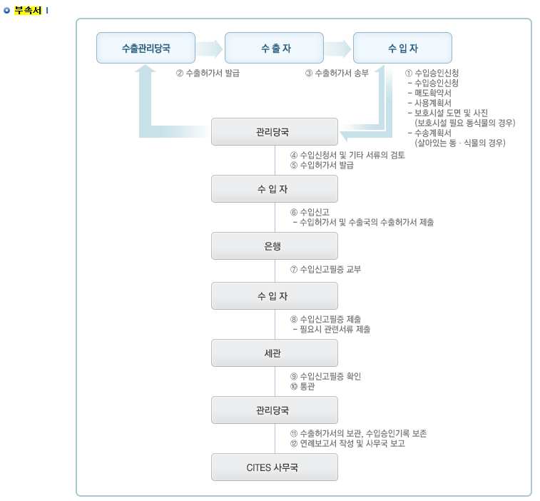 야생생물보호및관리에관한법률 · 통합공고 별표6에 게기된 국제적 멸종위기종(CITES)은 유역환경청장 또는 지방환경청장의 허가를 받아 수입할 수 있음.