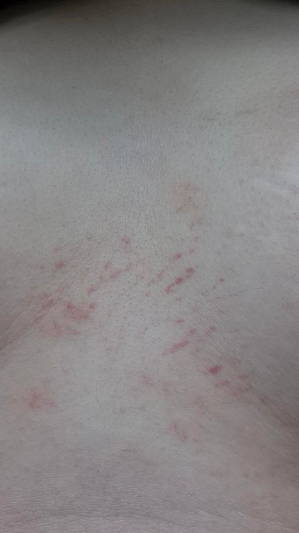 가슴쪽에 사진처럼 여드름인지 핏줄 터진 건지 뭐가 생기고 뾰루지도 한두개 났어요 피부염인가요? 가슴 한쪽에는 연한 붉은 반점도 있고 간지럽기도 해요 피부염이라면 무슨 피부염인가요