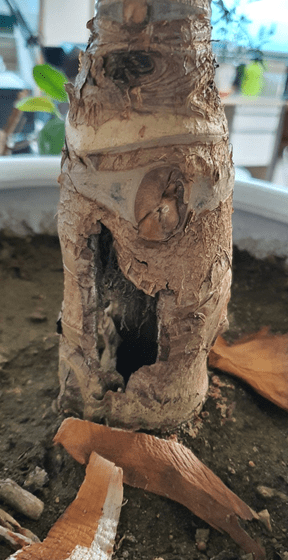 혹시 물을 자주 주는거는 아닌지요? 줄기나 몸통에 구멍이 나는것은 과다 수분에 의하여 나무가 썩어들어가는 것입니다.