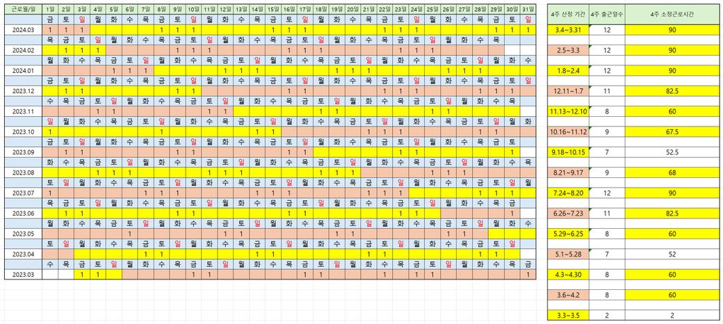 10월7일 토요일의 경우 근로계약서상 출근하는 요일이지만 사정상 무급으로 스케줄을 뺐습니다.