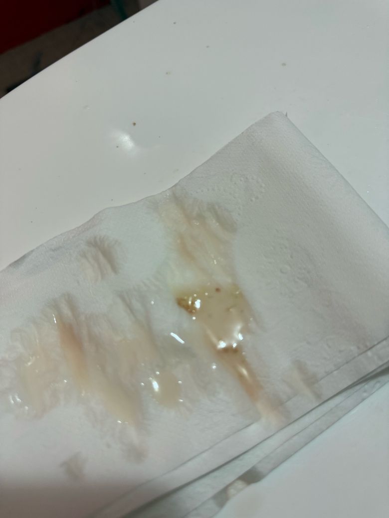 제시된 양상은 혈정액증 가능성이 높습니다. 정액에 갈색 또는 붉은 색이 섞여 보이는 경우로, 대부분은 일시적이며 양성 경과를 보입니다.