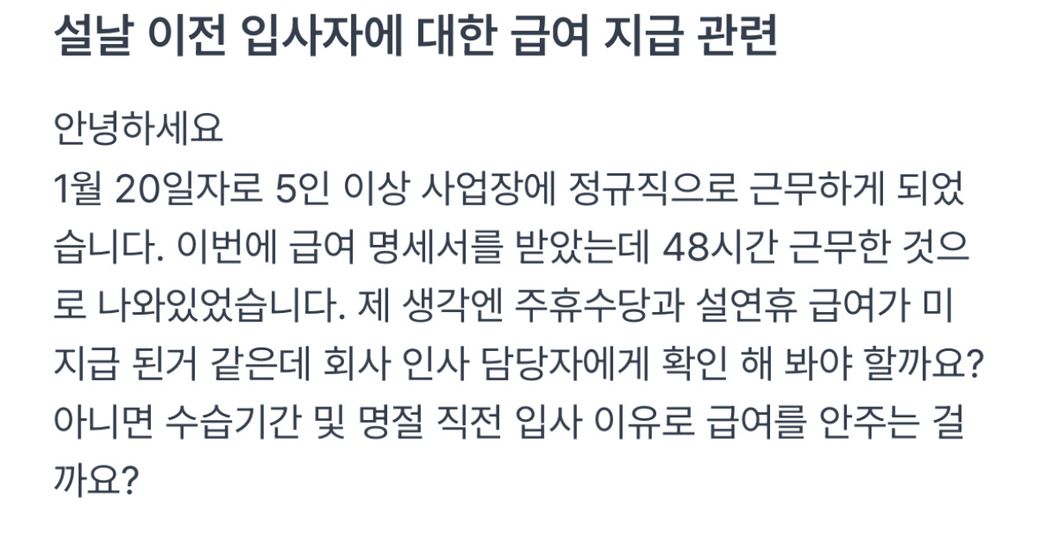 신규 입사자에 대한 쥬휴수당 및 명절급여