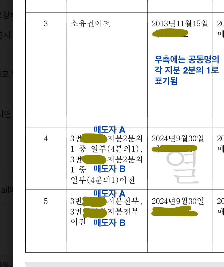 그리고 공동명의인 경우에 각각 별도의 순번으로 기재되어있는데, 이런 경우에도 문제가 없는(정상적인?)표기법인지도 문의드립니다^^;(저희 매도자 같은 경우 3번에 공동명의 지분 1/2로 같이 표기되어 있었는데, 저희는 4번,5번 항목으로 별도로 표기되어 있어서요)