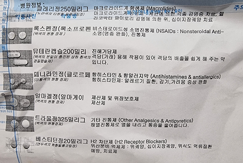 가래약과, 진통 소염제를 메인에 두고, 약을 먹는 과정에서 발생할 수 있는 위장 장애까지 고려하여 약을 잘 처방해주신것 같습니다.