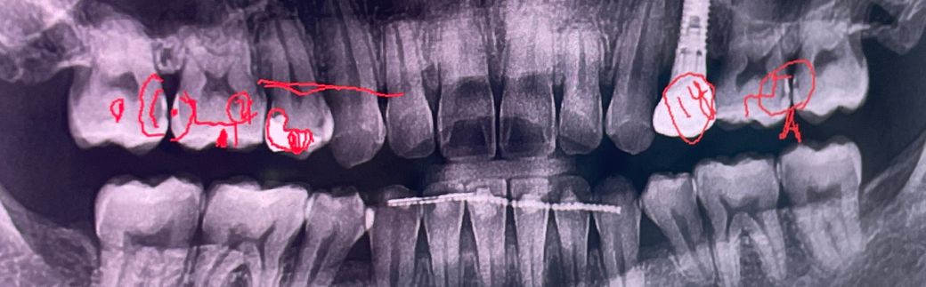 기존에 치료를 햇던 부분 아래부분에 충치가 다시 생긴거 같고 치아 사이에도 충치가 잇는것같습니다. 치료가 필요해 보입니다.