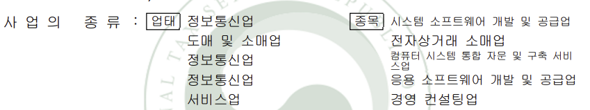 법인 사업자등록증에는 아래와 같은 업태와 종목을 기재하여 사업자등록증 발급을 완료하였습니다.