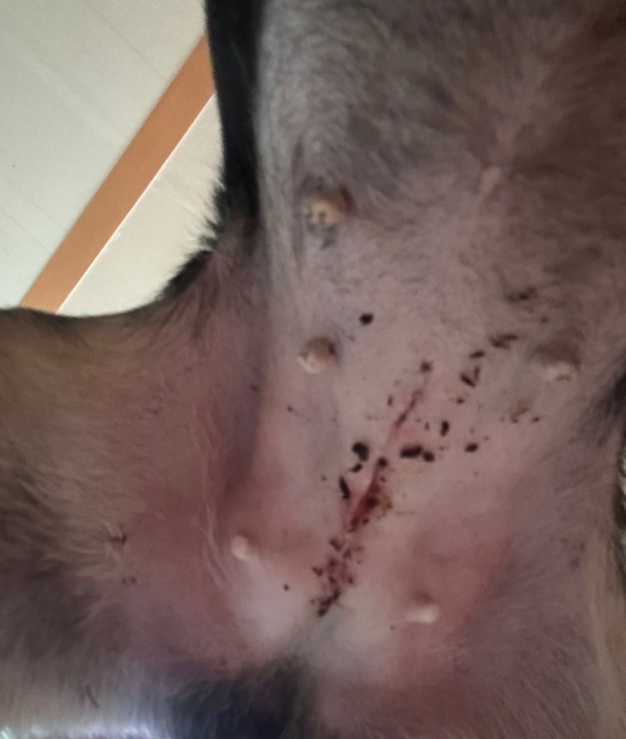 자궁축농증 수술 후 , 진물이 생겨서 또 수술하고 염증 수치도 괜찮아 4일입원 후 집에 왔고 밥도 잘 먹고 하는데 넥카라에 쓸려서 이런건지 왜 이럴까요? 진물은 나지 않는데