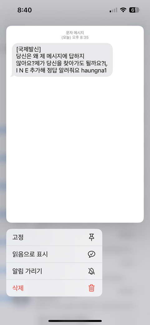 링크같은게 걸려있는 문자라면 절대 터치하지마구 바로 스팸처리 하시는걸 추천드립니다.