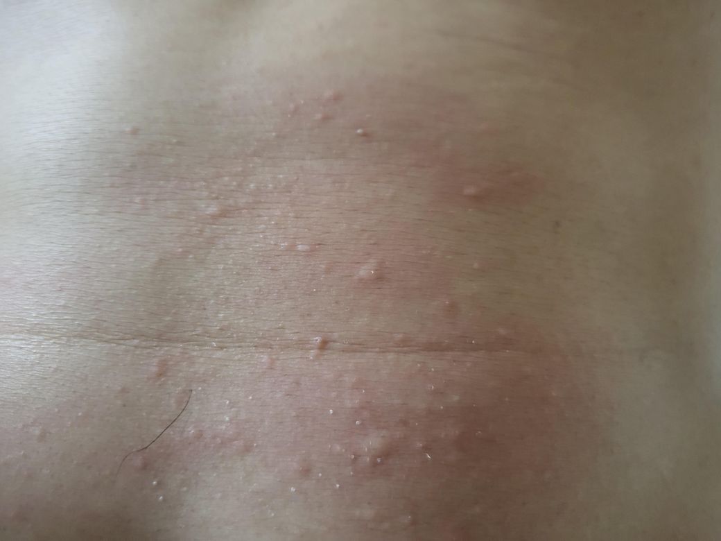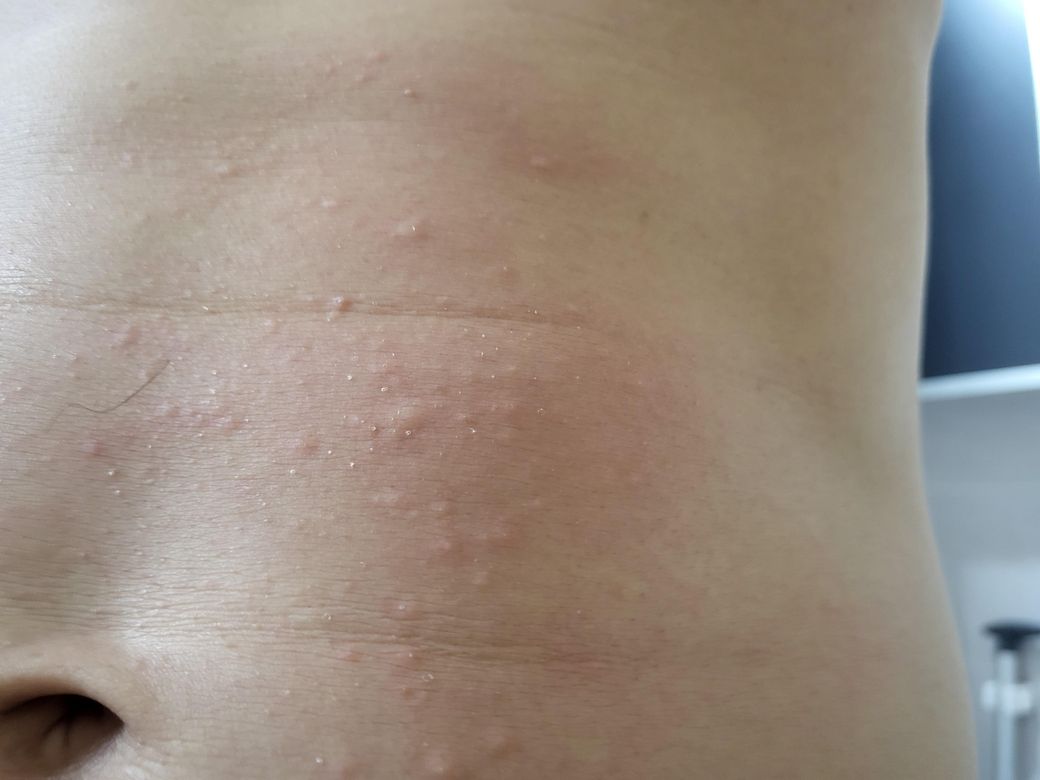 사진에 나온 병변으로 볼때는 두드러기 같습니다. 시원하게 하면 가라앉을것같습니다. 그래도 가라앉지않고 간지러운 증상이 지속되면 근처피부과에서 진료보시고 약을 처방받아야 할것 같습니다.