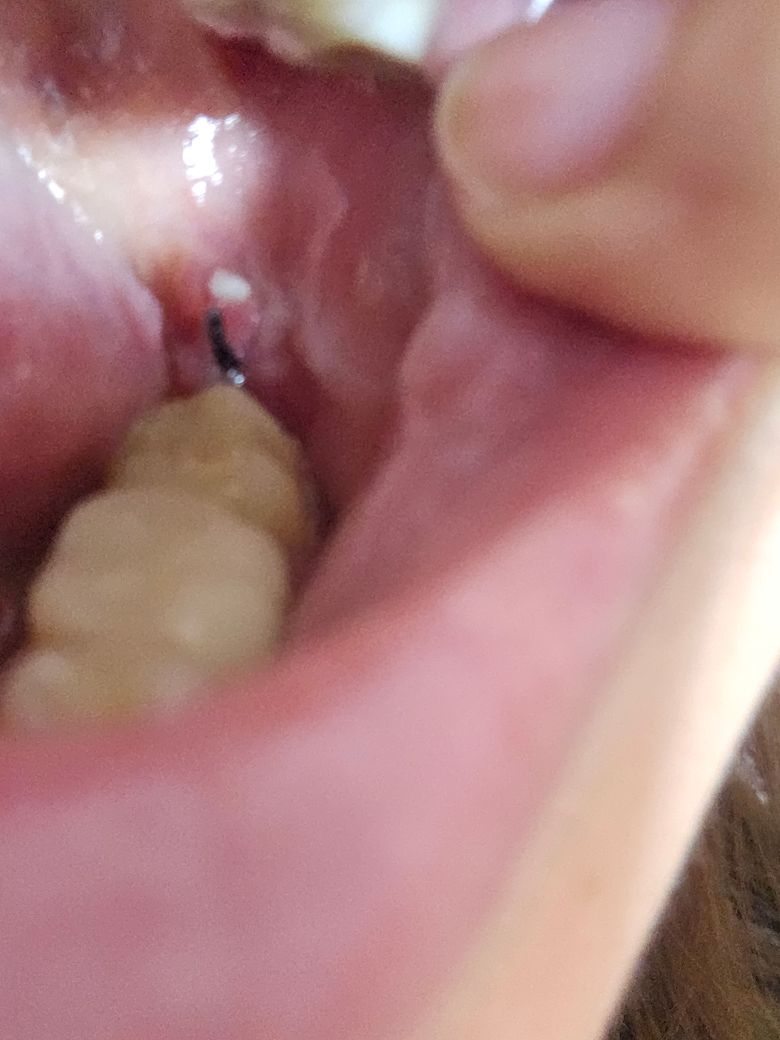 사랑니 발치후 5일이 지났는데 실밥 위에 사진처럼 흰색 구내염처럼 덩어리가 보입니다. 이게 염증인가요? 염증이라면 치과에 방문해야할까요?