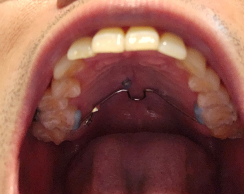 입천장 중앙에 스크류밖고 17번에 고무줄을 연결했고, 인접치아 이동 방지를 위해 16번-26번간 TPA 고정을 해놨습니다.