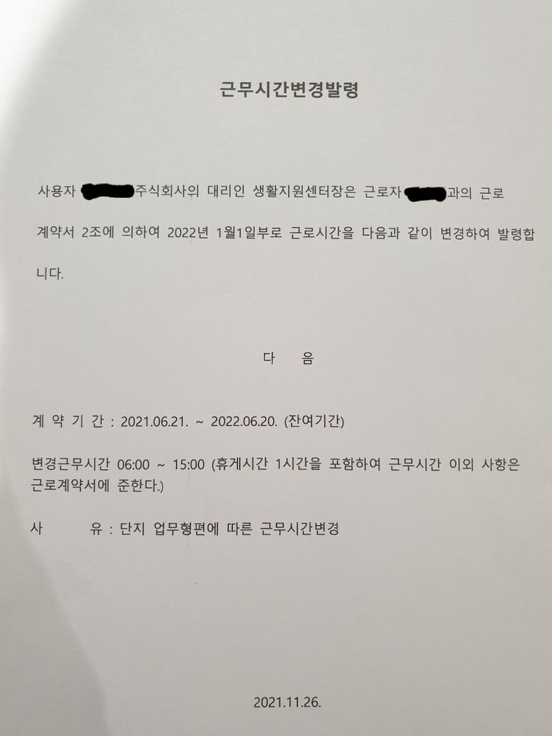 그리고 다음날 다른 관리자를 통해서 근무시간 변경 발령 서류를 받았고, 2022년 1월 1일부터 발령한다고 합니다.