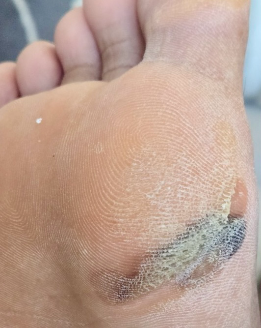 한달전쯤 새신발 신고 달리기 하는데 발이 감각이 없어지면서 불타는것처럼 느껴져서 신발 벗어보니 지금 상태보다 더 심각한 피멍인 상태였지만, 괜찮아지겠지하고 지내다보니 통증은 없어졌는데 엄지 발가락 아랫 부분 발바닥이 저렇게 됐어요ㅜ