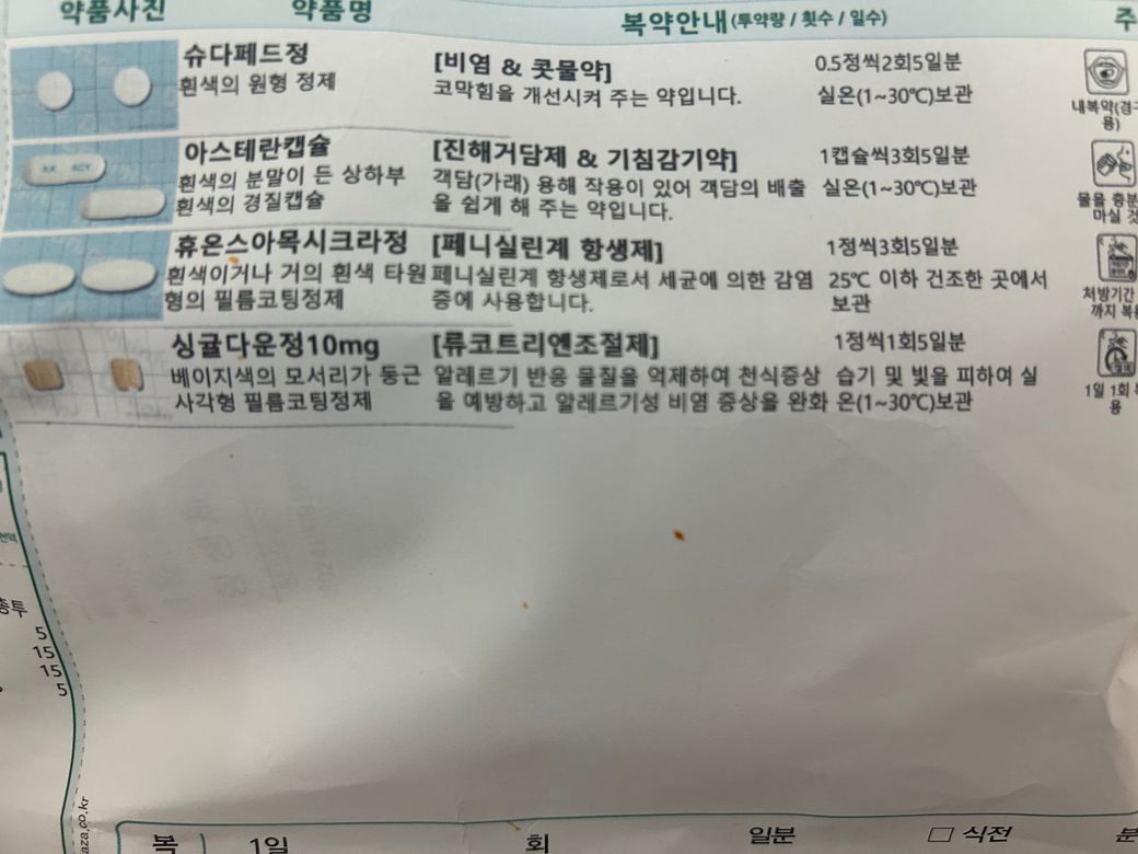 감기기운 및 비염, 알러지러 사진 속 약을 처방받아서 복용 중인데 두통 때문에 타이레놀 섭취 가능한가요? 안되면 다른 성분의 진통제는 가능할까요