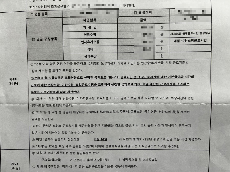 계약서가 가려져서 연차수당이 선지급된 것인지 확인이 어려우나, 만약 선지급된 경우라면 연차를 미사용하신 후 퇴사하셨더라도 연차수당 지급을 요구하기에는 어려울 것 같습니다.