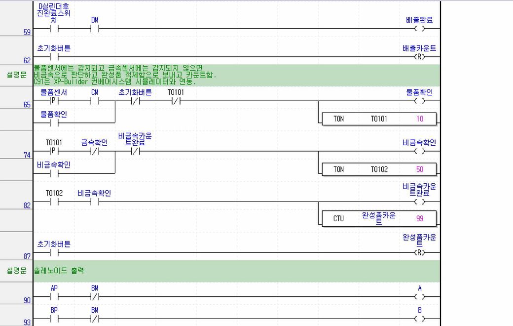 컨베이어 모터 동작 신호에 연동해 황색등 ON/OFF로직 작성 .금속 감지시 실린더D동작