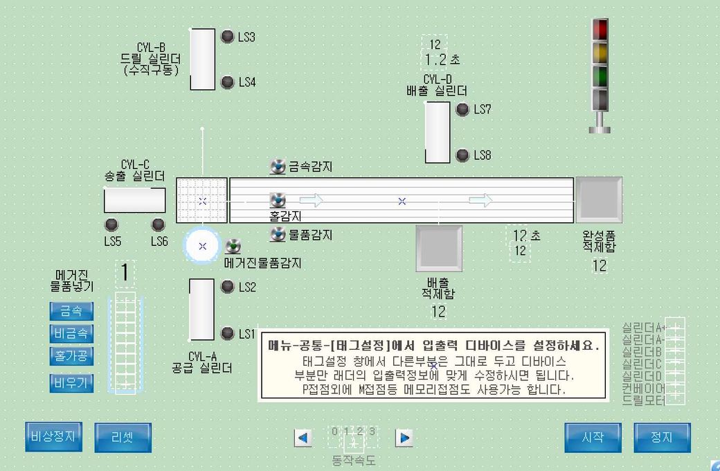 2. 시작버튼→ 적색, 정지버튼→ 황색, 리셋버튼→ 녹색, 비상정지버튼→ 백색, 매거 진에 투입제품이 비었을 시 백색램프 점멸 동작하는 프로그램(리셋(초기화)버튼의 스크립트에 조건이 있어서 녹색버튼이 정확히 동작하지 않을 수 있음.)