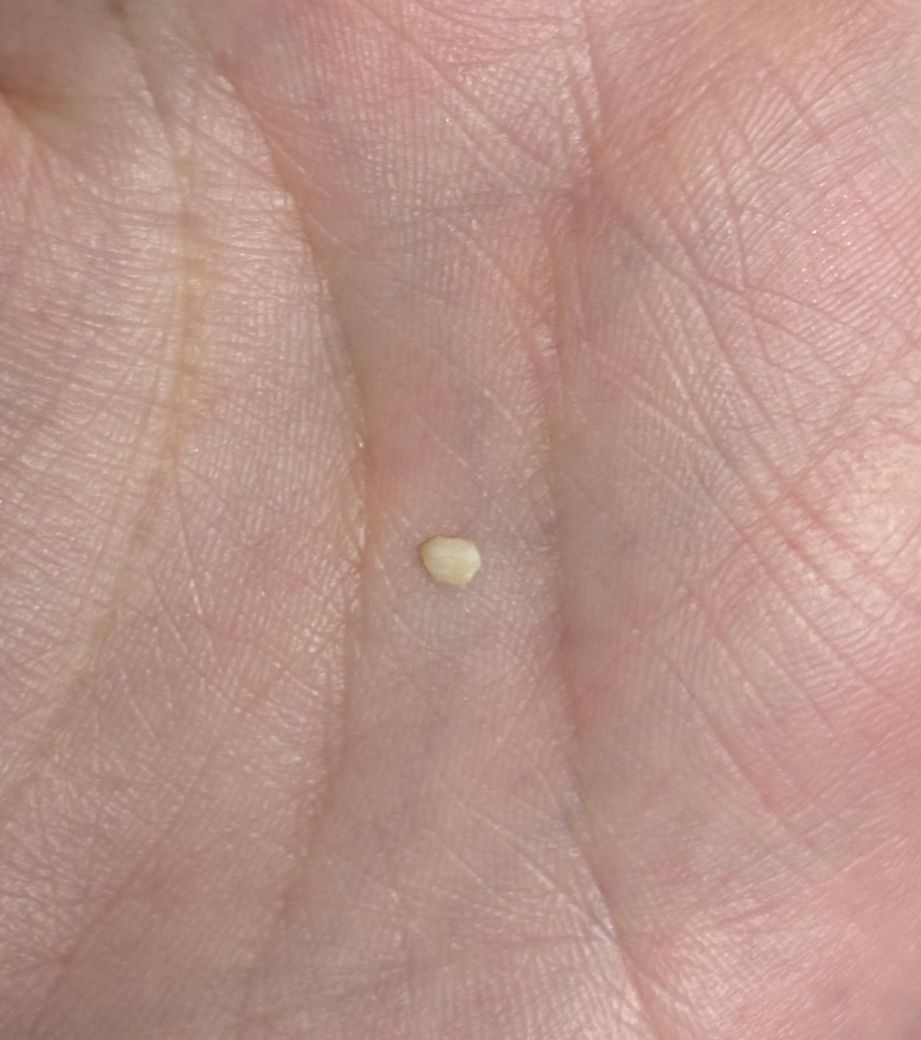 접착제 찌꺼기로 보입니다. 치아와 치아 틈새에 접착제가 남는 경우가 종종 발생합니다. 떨어져 나온 것으로 끝이니 그냥 있어도 됩니다.