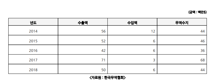 우리나라 전체 수출규모로 보았을때는 굉장히 적은 금액이고 수출건수도 1,000건을 넘지 않는 등 많은 무역거래가 이루어지고 있느 국가는 아닌 것으로 보여집니다.