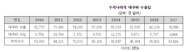 쿠바는 우리나라와 무역량이 적은 국가입니다. 이에 따라, 정확한 통계자료를 구하기가 어렵습니다.