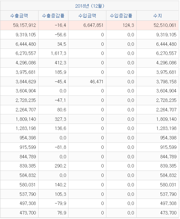 즉, 2018년 기준 쿠바로의 수출액은 약 5천만달러, 수입액은 6백만 달러입니다.